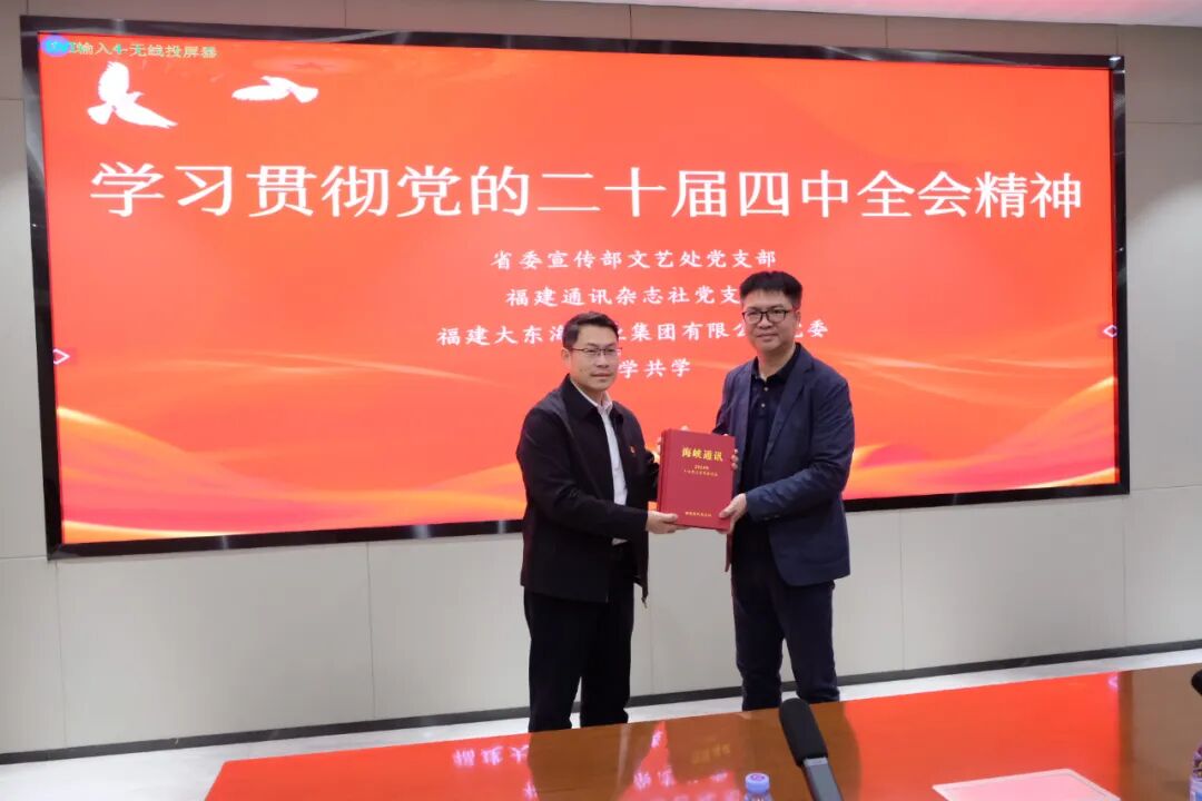 随后,三方党员齐聚大东海集团党建会议室,围绕学习贯彻党的二十届四中全会精神开展专题交流。党员们结合自身岗位实际,分享学习心得,重点就“深化联学共学长效机制”“创新政企党建协同模式”“以党建引领宣传赋能企业发展”等议题展开深入研讨,在思想碰撞中凝聚共识、激发合力。活动尾声,还举行了赠刊(《海峡通讯》)仪式。