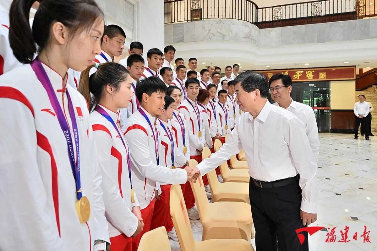 周祖翼指出,福建发展体育事业有着良好基础。要深入学习贯彻习近平总书记关于体育工作的重要论述,高水平建设体育强省,努力为建设体育强国作出更大贡献。全省上下要积极营造重视体育、支持体育、参与体育的浓厚氛围,广泛宣传我省体育健儿在赛场上的拼搏精神,进一步激发广大干部群众干事创业的精气神,以争优、争先、争效的实际行动推动新福建建设再上新台阶。周祖翼表示,省委、省政府将一如既往关心重视体育事业,落实全民健身和健康中国战略,推动群众体育、竞技体育全面发展,推动体育产业、体育文化繁荣发展,关心支持运动员、教练员成长,当好大家的坚强后盾。