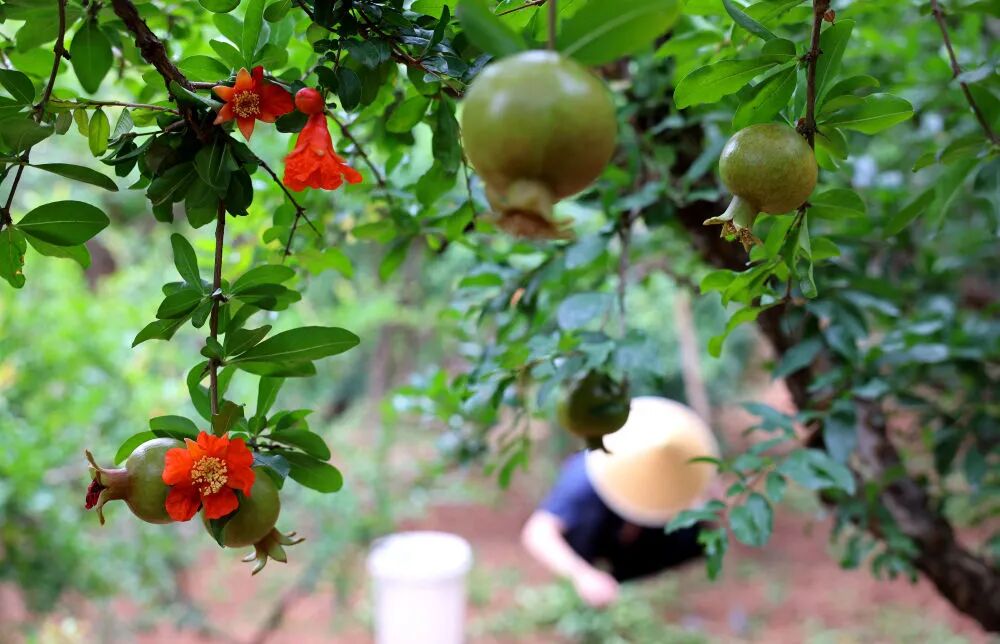 果农在山东枣庄峄城石榴园的石榴树下劳作(2025年6月18日摄)。新华社发(孙中喆 摄) 走进甘肃天水麦积区南山花牛苹果基地,勉励“要加强品种保护和培育,优化种植方式,创新营销模式”;