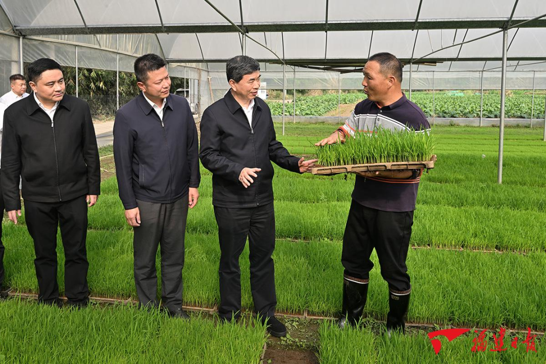 24日,周祖翼在龙岩市永定区坎市粮食作物单产提升种植示范项目调研。 仲春时节,闽西红土地遍染新绿、生机盎然。周祖翼一行来到旧县镇新坊村,详细察看村容村貌,询问村里开展春耕备耕、惠农政策落实、人居环境整治和医疗卫生服务等情况。周祖翼与村干部、村民代表深入交流,希望大家带头弘扬苏区精神、长征精神,讲好红色故事、砥砺奋斗初心,让革命传统代代相传。要充分发挥基层党组织战斗堡垒作用和党员先锋模范作用,当好“领头羊”,以正确政绩观引领促进共同富裕。在坎市粮食作物单产提升种植示范项目,周祖翼走进育秧大棚、辣椒种植大棚和玉米种植地块,与家庭农场负责人、乡镇党组织负责人等深入交谈,认真询问种子、化肥等农资储备是否充足,仔细察看早稻播种育秧、田间管理和现代化农机设备使用等情况,并了解高标准农田建设资金、农机购置补贴监管工作。周祖翼叮嘱大家要切实扛起粮食安全责任,抢抓农时做好春耕备耕,强化农资供应保障,高质量推进高标准农田建设,加快提升种业创新、农业科技装备水平,壮大“新农人”队伍,强化涉农资金项目全过程监管,促进粮食生产增产增效。