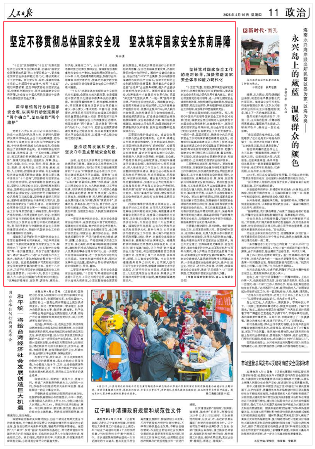 《人民日报》(2026年04月16日第11版) 坚定不移贯彻总体国家安全观 坚决筑牢国家安全东南屏障 周祖翼 “十五五”规划纲要对“十五五”时期我国经济社会发展作出战略部署,明确将“国家安全屏障更加巩固”纳入主要目标之一,要求推进国家安全体系和能力现代化,建设更高水平平安中国。我们要全面、深刻、准确贯彻落实党的二十届四中全会精神,按照“十五五”规划纲要部署,坚定不移贯彻总体国家安全观,统筹好发展和安全,坚决筑牢国家安全东南屏障,为全省在中国式现代化建设中奋勇争先提供坚实安全支撑。 深学细悟笃行总体国家安全观,以实际行动坚定拥护“两个确立”、坚决做到“两个维护” 党的十八大以来,以习近平同志为核心的党中央顺应时代发展大势,从新时代坚持和发展中国特色社会主义的战略高度,把马克思主义国家安全理论和当代中国安全实践、中华优秀传统战略文化结合起来,创造性提出了总体国家安全观。总体国家安全观内涵丰富、思想深邃,是一个系统完整、逻辑严密、相互贯通的科学理论体系,其关键是“总体”,强调大安全理念,涵盖政治、军事、国土、经济、金融、文化、社会、科技、网络、粮食、生态、资源、核、海外利益、太空、深海、极地、生物、人工智能、数据等诸多领域,而且将随着经济社会发展不断动态调整;其核心要义集中体现为“十个坚持”,即坚持党对国家安全工作的绝对领导,坚持中国特色国家安全道路,坚持以人民安全为宗旨,坚持统筹发展和安全,坚持把政治安全放在首要位置,坚持统筹推进各领域安全,坚持把防范化解国家安全风险摆在突出位置,坚持推进国际共同安全,坚持推进国家安全体系和能力现代化,坚持加强国家安全干部队伍建设。总体国家安全观是我们党历史上第一个被确立为国家安全工作指导思想的重大战略思想,是中国共产党和中国人民捍卫国家主权、安全、发展利益百年奋斗实践经验和集体智慧的结晶,是马克思主义国家安全理论中国化的最新成果,是习近平新时代中国特色社会主义思想的重要组成部分,是新时代国家安全工作的根本遵循和行动指南。 福建是习近平新时代中国特色社会主义思想的重要孕育地和实践地。习近平同志在福建工作期间就高度重视国家安全工作,鲜明提出了“坚持‘两手抓’,切实维护社会稳定”等一系列重要理念,开创了治理“餐桌污染”、建设“食品放心工程”以及治理长汀水土流失、推进木兰溪全流域综合整治等一系列重大实践。这些都是福建学习贯彻总体国家安全观的宝贵财富和独特优势。党的十八大以来,习近平总书记多次对福建国家安全工作提出重要要求。2019年3月,参加十三届全国人大二次会议福建代表团审议时提出:“统筹做好稳增长、促改革、调结构、惠民生、防风险、保稳定工作”。2021年3月,在福建考察时提出统筹发展和安全,强调要有效遏制重特大安全生产事故,推动扫黑除恶常态化。2024年10月,在福建考察时提出,加强对台风、地震等自然灾害防范,提高防灾减灾救灾能力。这些都为我们做好国家安全工作提供了根本遵循。 “十五五”时期是基本实现社会主义现代化夯实基础、全面发力的关键时期,也是福建在中国式现代化建设中奋勇争先的关键时期。我们要带着特殊责任、特殊感情、特殊使命,深刻理解把握总体国家安全观的重大意义、核心要义、精神实质、丰富内涵、实践要求,传承弘扬习近平同志在福建工作期间相关重要理念和重大实践,贯彻落实习近平总书记关于国家安全工作的重要论述精神,把坚定拥护“两个确立”、坚决做到“两个维护”内化于心、外化于行,把安全发展贯穿福建发展的全过程各方面,实现高质量发展和高水平安全良性互动,以福建一域之稳为全局之安作贡献。 坚持统筹发展和安全,坚决守牢重点领域安全防线 当前,全党正扎实开展树立和践行正确政绩观学习教育。国家安全工作是党的工作的重要组成部分,我们必须把正确政绩观贯穿到“十五五”时期国家安全各项工作之中,努力建设更高水平平安福建。要聚焦“立党为公”,树立大局观念,坚决把国家安全作为“头等大事”抓紧抓实;聚焦“为民造福”,坚持以人民安全为宗旨,为人民出政绩、以实干出政绩,切实满足国泰民安这个人民群众最基本、最普遍的愿望;聚焦“科学决策”,坚持从实际出发、按规律办事,深入研究破解制约安全发展的重点难点问题;聚焦“真抓实干”,实事求是、求真务实,敢于担当、勇于作为,全力防范化解重大风险,打造社会更加有序、基础更加牢固、治理更加有效、人民更加满意的平安福地。 一要坚决维护政治安全。政治安全是国家安全的根本,在国家安全中居于统领地位。福建地处东南沿海,维护政治安全责任重大,必须坚持把捍卫政治安全摆在首位,全力维护政权安全、制度安全、意识形态安全。持续推进反暴恐斗争,严厉打击敌对势力渗透、破坏、颠覆、分裂活动。严格落实意识形态工作责任制,强化高校、网络等领域阵地建设和管理,旗帜鲜明反对和抵制各种错误思潮。深入开展宗教事务治理专项行动,进一步规范民间信仰活动管理,进一步规范和引导民俗文化活动。完善危机管控制度机制,强化突发事件应对处置,坚决防止其他领域风险向政治领域转化、传导、叠加。 二要坚决维护经济安