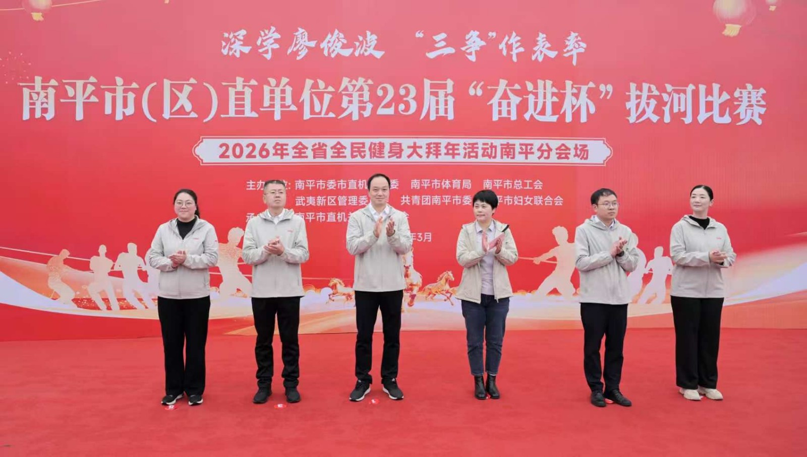“加油!加油!加油!” 南平市武夷新区天圆地方广场上,助威声此起彼伏,现场气氛热烈。 3月5日,由南平市委市直机关工委、南平市体育局、南平市总工会、武夷新区管理委员会、共青团南平市委、南平市妇女联合会联合主办的第23届 “奋进杯” 拔河比赛在此举行。比赛吸引了来自市直机关、企事业单位以及部分建阳区直机关、企事业单位的49支队伍、近600名选手参赛。 比赛分四片场地同时进行,参赛队员们奋力拼搏、齐心协力,充分展现出坚韧毅力与良好团队协作精神。经过100多场次的激烈角逐,15支获奖队伍脱颖而出。颁奖仪式上,南平市医保局、南平市消防救援支队、建阳监狱、闽铝轻量化公司分别夺得机关(事业)单位 A、B、C 组及企业组第一名。 据了解,“奋进杯” 拔河比赛已连续举办23届,是南平市市直机关文体活动的品牌项目之一。此次比赛,全面展现了南平机关干部职工敢于拼搏、勇于争先、昂扬奋进的精神风貌。参赛选手纷纷表示,将把赛场上的拼搏热情转化为工作中的强大动力,吹响 “开局争先 实干为民” 的号角,持续深化拓展 “深学廖俊波、‘三争’作表率” 实践活动,以更加饱满的精神状态、更加严谨的工作作风、更加奋发有为的奋进姿态,为谱写中国式现代化福建篇章贡献南平机关力量。 |