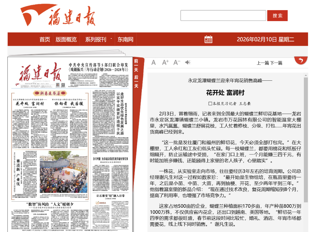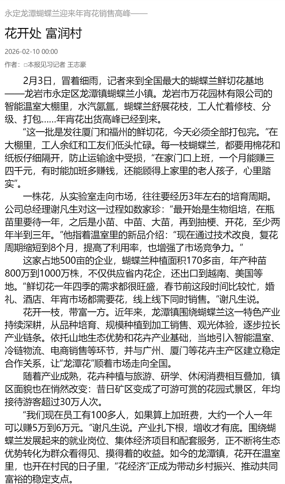 新春奋进正当时,“三争”行动践初心。春节期间,福建日报深入开展“三争”行动,推出“新春走基层”专栏,报道记者深入田间地头、工厂车间、社区街巷,用笔和镜头捕捉“开局起势”的拼搏之志、实干之姿,见证各地全力以赴拼经济、抓改革,促发展、惠民生,确保“十五五”开好局、起好步,奋力开创中国式现代化福建实践的新局面。 01 冒着细雨,福建日报龙岩记者站记者王志豪来到全国最大的蝴蝶兰鲜切花基地——龙岩市永定区龙潭镇蝴蝶兰小镇。雨衣上的水珠尚未干透,他便已手持采访设备、攥紧笔记本,与种植大户面对面攀谈。温室里,洁白的蝴蝶兰竞相盛放,镜头前,一问一答间满是乡村振兴的热度。这一画面,定格了新闻工作者扎根一线、求真务实的采访瞬间,更记录下闽西乡土新春里的产业兴旺图景。 福建日报龙岩记者站记者王志豪