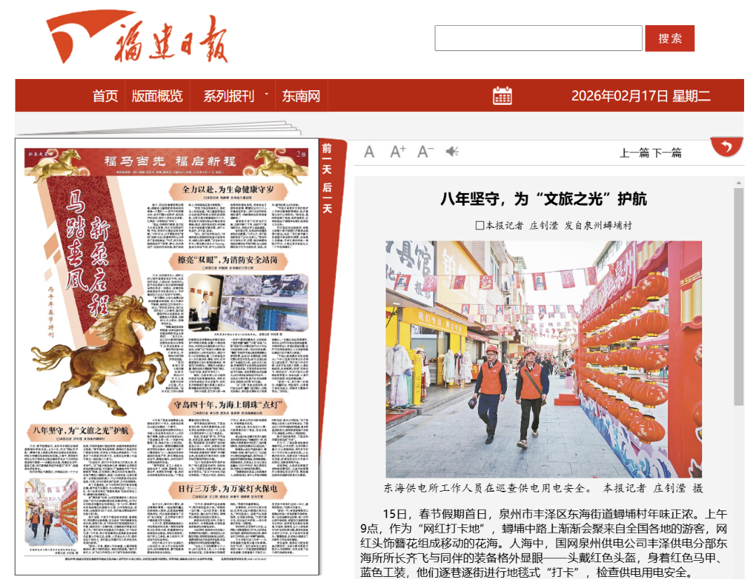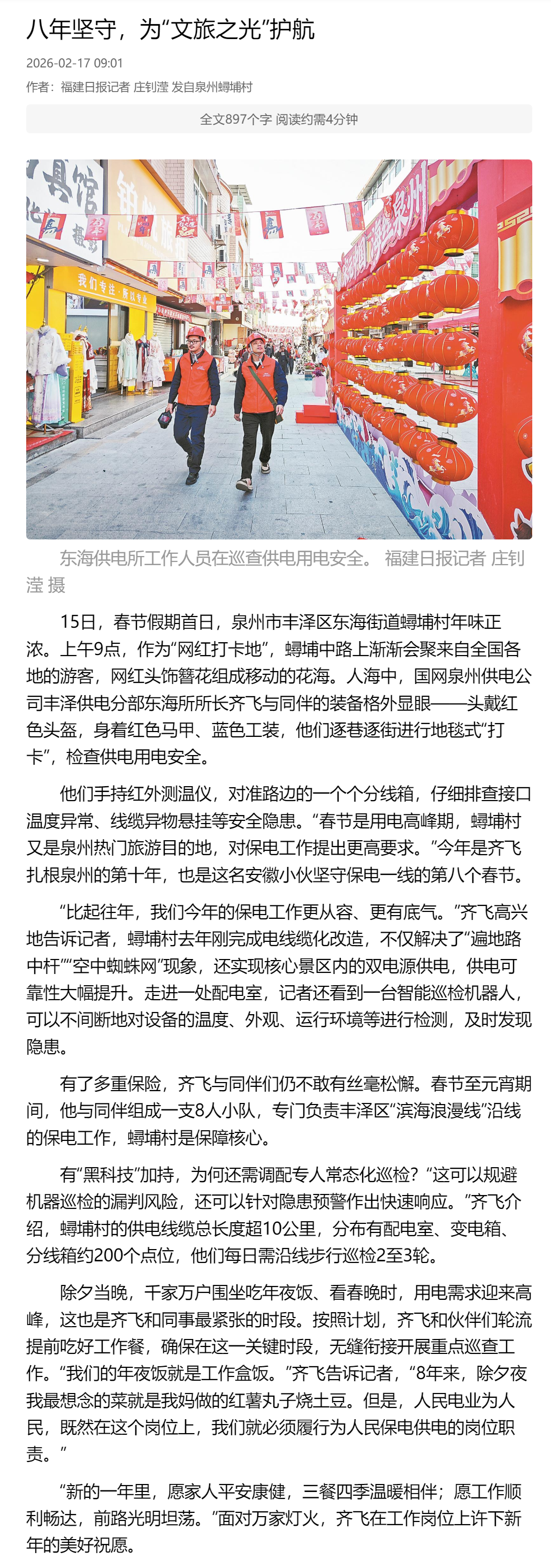 03 除夕前一天,福建日报泉州记者站记者庄钊滢深入“网红打卡地”——泉州市丰泽区东海街道蟳埔村,在游客往来穿梭的街巷里,现场采访国网泉州供电公司丰泽供电分部东海所工作人员,实地体验他们在春节假期怎样尽责保电一线、逐巷逐街进行地毯式检查供电用电安全,守护万家灯火。 福建日报泉州记者站记者庄钊滢