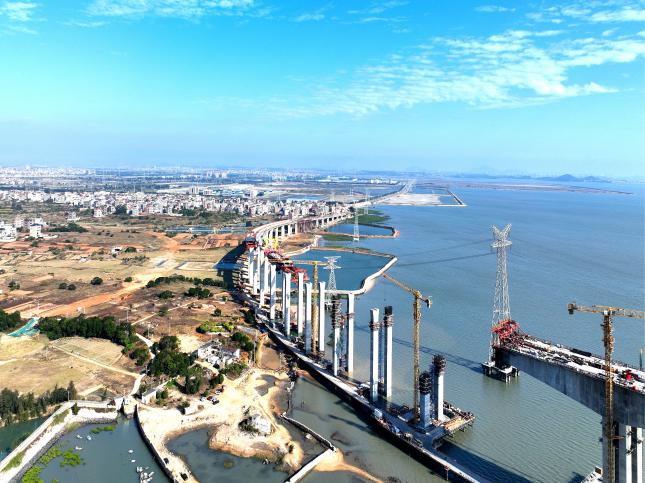国道G228线福鼎小白岩至店下段作为关键节点路段,需要攻克狮头岩、南门、公鸡岩三座隧道及洪湖大桥、巽城大桥等控制性节点。为推动项目取得关键进展,青年突击队多次深入建设工地,协助破解多项施工难题。2月13日,新线正式通车,福鼎市区至店下镇通行时间从原来的1小时缩短至25分钟,成为沿线群众出行、特色农业产品运输、乡村旅游和城乡融合发展便捷畅通的民生路、致富路。 在攻坚克难中挺膺担当 在福清,国道G228线东港特大桥项目正处于主桥结构攻坚的关键阶段。这座全长近4公里的跨海大桥,自开工以来面临着复杂水文地质条件和多变海上天气带来的多重挑战。